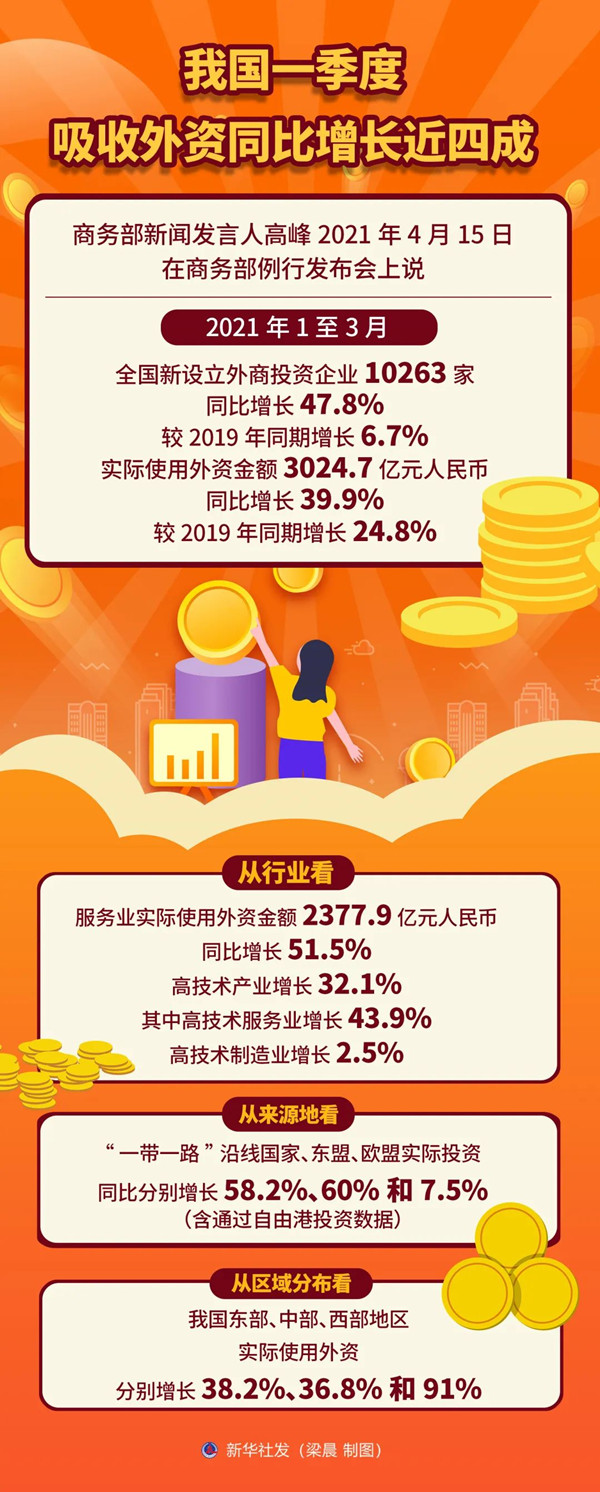 商务部新闻发言人高峰4月15日在商务部例行发布会上说,今年1至3月,全国新设立外商投资企业10263家,同比增长47.8%,较2019年同期增长6.7%;实际使用外资金额3024.7亿元人民币,同比增长39.9%,较2019年同期增长24.8%。