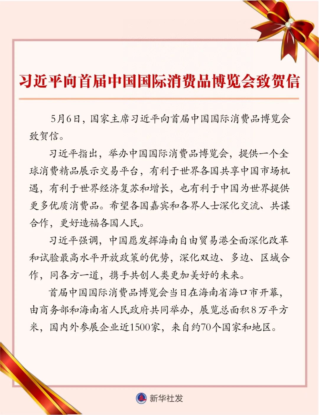 5月6日,国家主席习近平向首届中国国际消费品博览会致贺信。