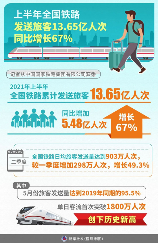 据新华社7月11日报道,记者从中国国家铁路集团有限公司获悉,2021年上半年,全国铁路累计发送旅客13.65亿人次,同比增加5.48亿人次、增长67%。